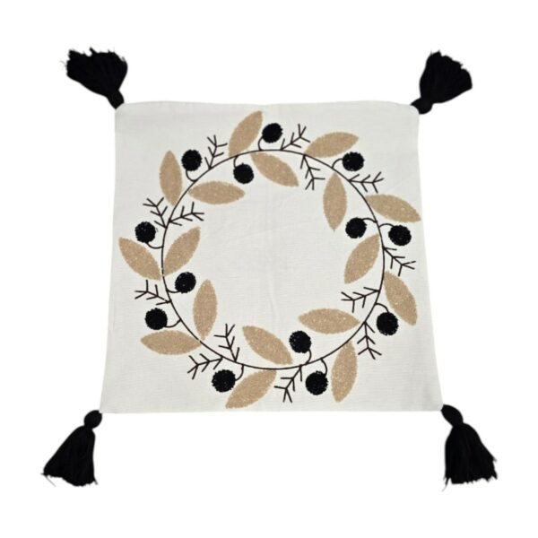 • Motif central brodé : couronne de feuillage beige et baies noires sur fond blanc cassé