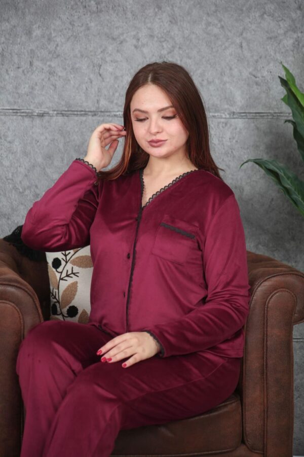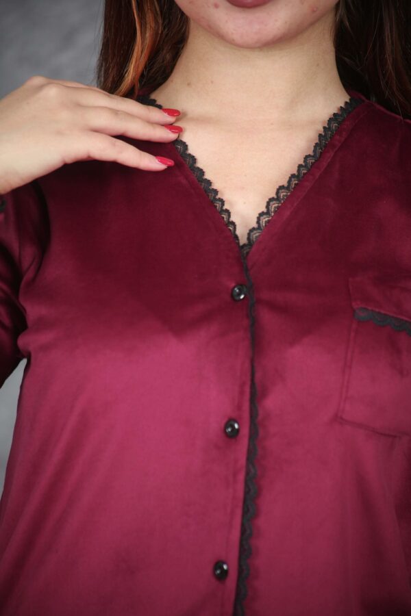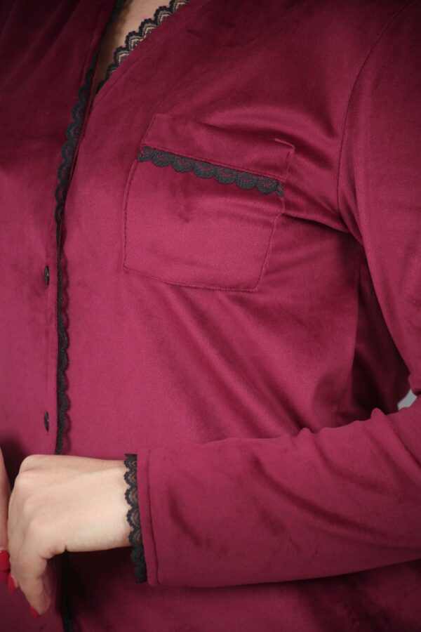 Plongez dans un cocon de confort avec ce pyjama en velours au toucher ultra-doux et à l’allure raffinée. Sa teinte bordeau profonde est sublimée par des finitions en dentelle noire qui soulignent avec délicatesse le col, les poignets et la poche poitrine. Le tissu velours, souple et légèrement brillant, enveloppe le corps avec chaleur tout en laissant respirer la peau.