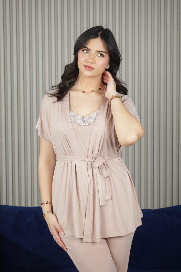 • Ensemble complet et polyvalent (pantalon + short + peignoir).