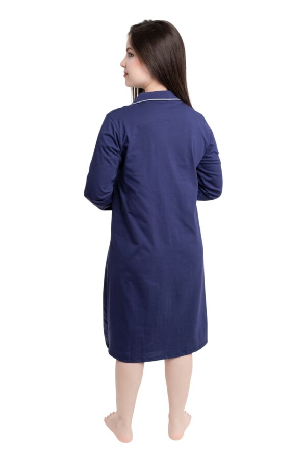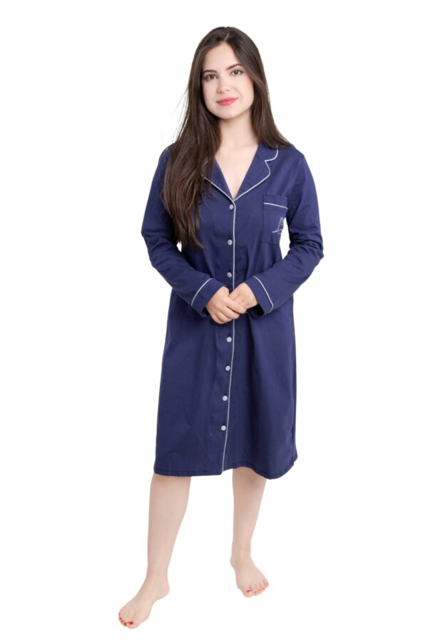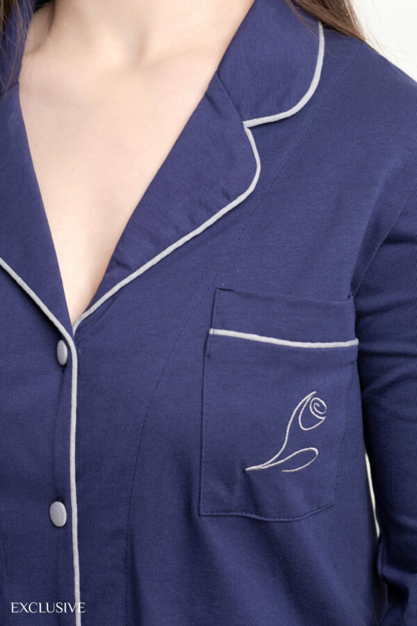 • Détails contrastés : Piping blanc sur col, poignets et patte de boutonnage
