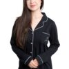 Offrez-vous une pause chic avec cette robe noire boutonnée, soulignée de délicates finitions blanches qui encadrent le col et les bords avec raffinement.