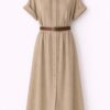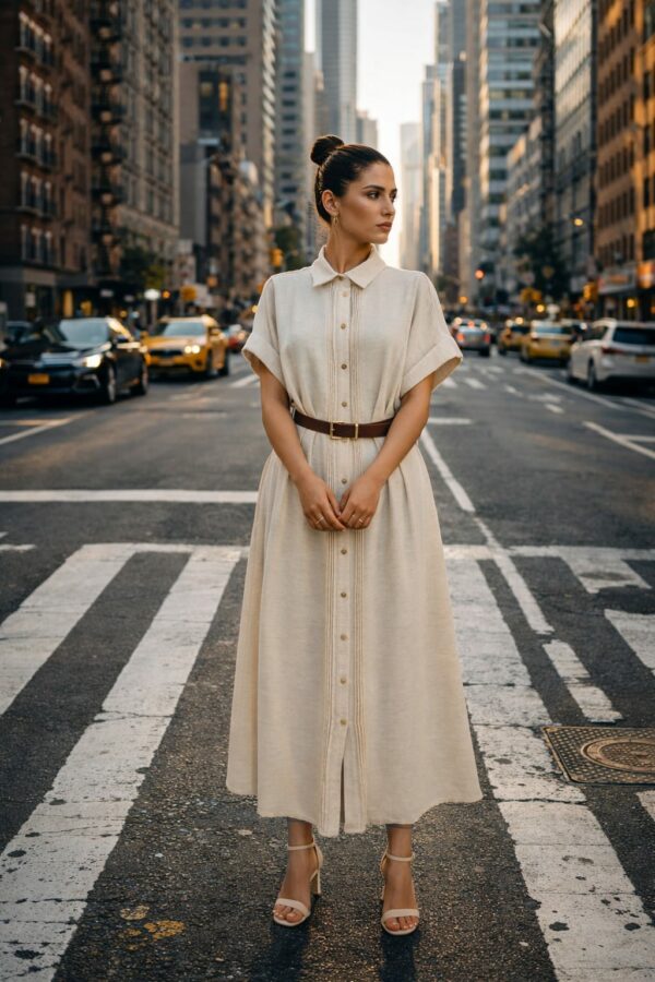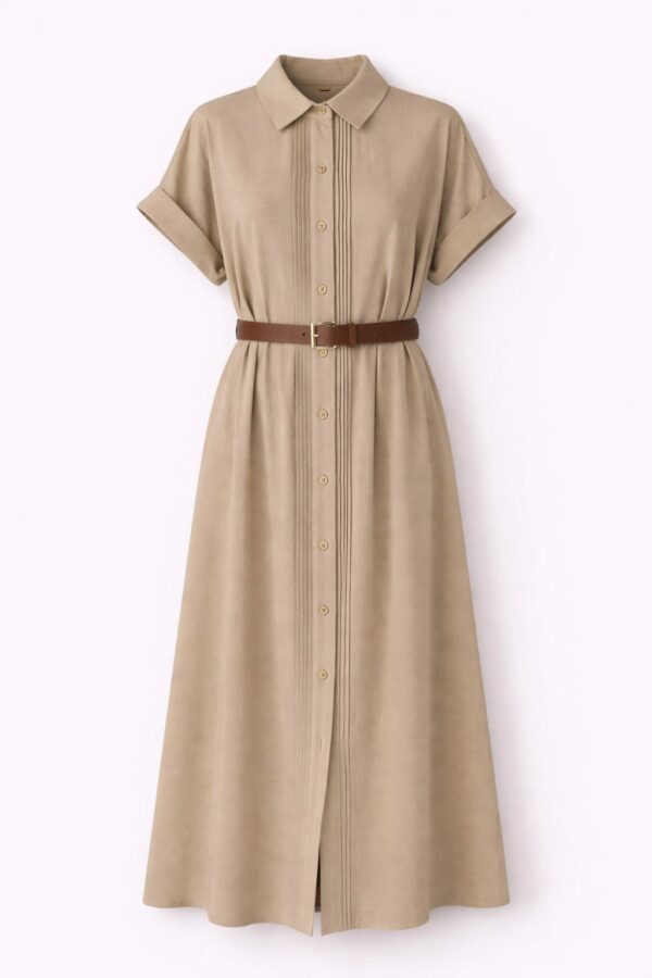 Une robe‑chemise qui allie simplicité et raffinement : la douceur du beige, la légèreté des plis, et la ceinture qui souligne la taille avec grâce.
